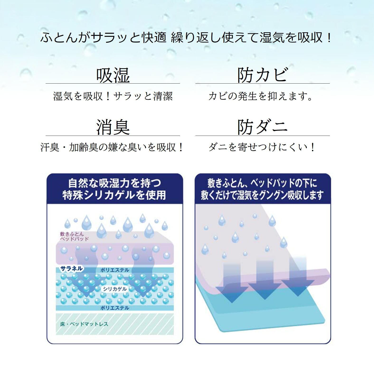 敷き布団、ベッドパッドの下に敷くだけでシリカゲルが、湿気やイヤなニオイをグングン吸収します。